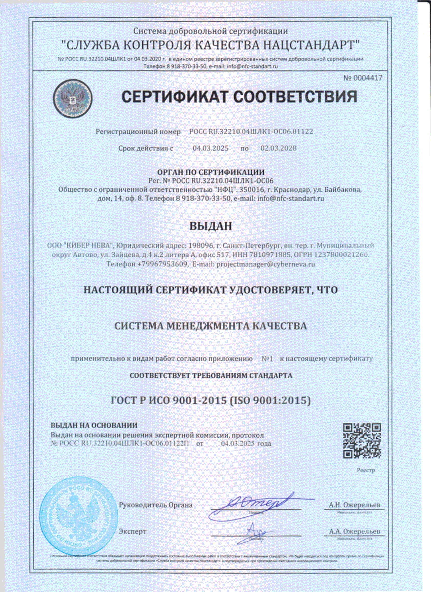 We are pleased to announce that CYBER NEVA LLC has successfully certified its quality management system according to the international standard GOST R ISO 9001-2015 (ISO 9001:2015). The certificate was issued by the certification body NFC LLC and confirms the high level of quality management in the company.